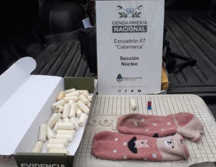 Los efectivos se encontraban desplegados sobre el kilómetro 596 de la Ruta Nacional Nº 38, a la altura de la localidad El Portezuelo. Allí, detectaron que dos pasajeras de nacionalidad boliviana no contaban con constancias de ingreso legal al país, trasladando un total de 42 cápsulasconteniendo una sustancia pulverulenta compacta, en el interior de medias ubicadas en el lateral de sus asientos.