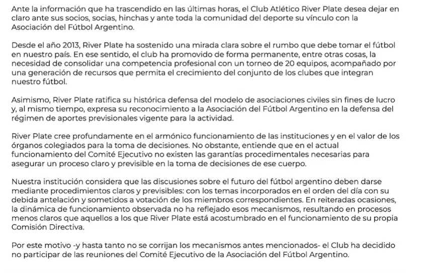 “Nuestra institución considera que las discusiones sobre el futuro del fútbol argentino deben darse mediante procedimientos claros y previsibles: con los temas incorporados en el orden del día con su debida antelación y sometidos a votación de los miembros correspondientes. En reiteradas ocasiones, la dinámica de funcionamiento observada no ha reflejado esos mecanismos, resultando en procesos menos claros que aquellos a los que River Plate está acostumbrado en el funcionamiento de su propia Comisión Directiva”, criticó la dirigencia de River.